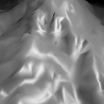 The landscape is from a 3D model of a mountain. I found a section on the side I liked and zoomed in. Rendering the 3D scene produced two images. One is like a black and white photo. The other encodes the surface normal at each point - how each bit of the mountain is angled in relation to the viewer. Bluer spots are angled more to the left; redder points more to the right. It gets greener the more it angles towards the top. It's not meant to be looked at at, just to tell the program about the topology.